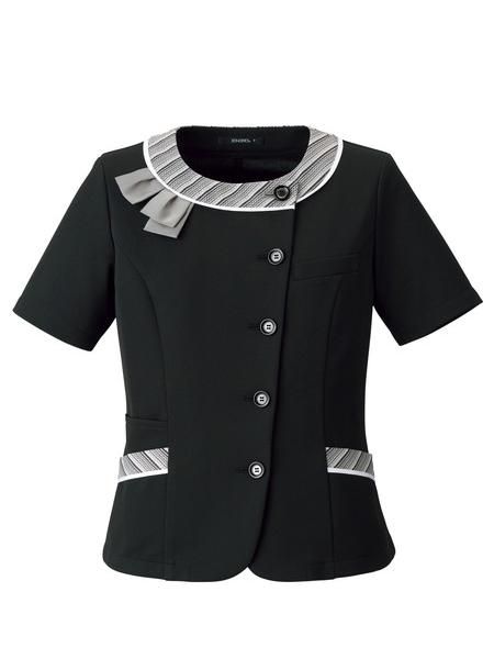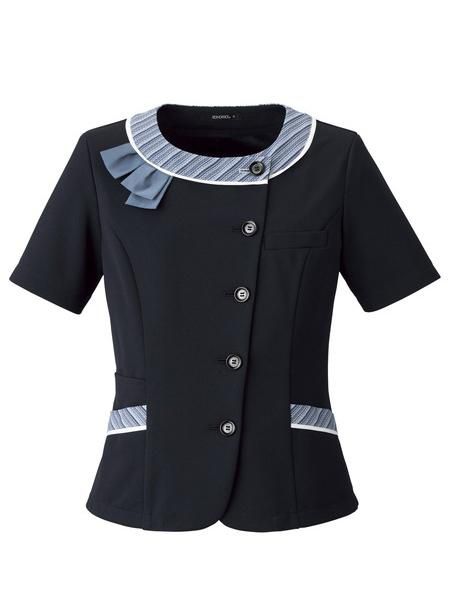 〈AJ0853〉ブラック/ネイビーのボディに洗練されたアシンメトリーデザイン、グラデーションボーダーの衿が印象的なオーバーブラウス。衿リボンは一緒に洗濯が可能です。12,144円(本体11,040円、税1,104円)
